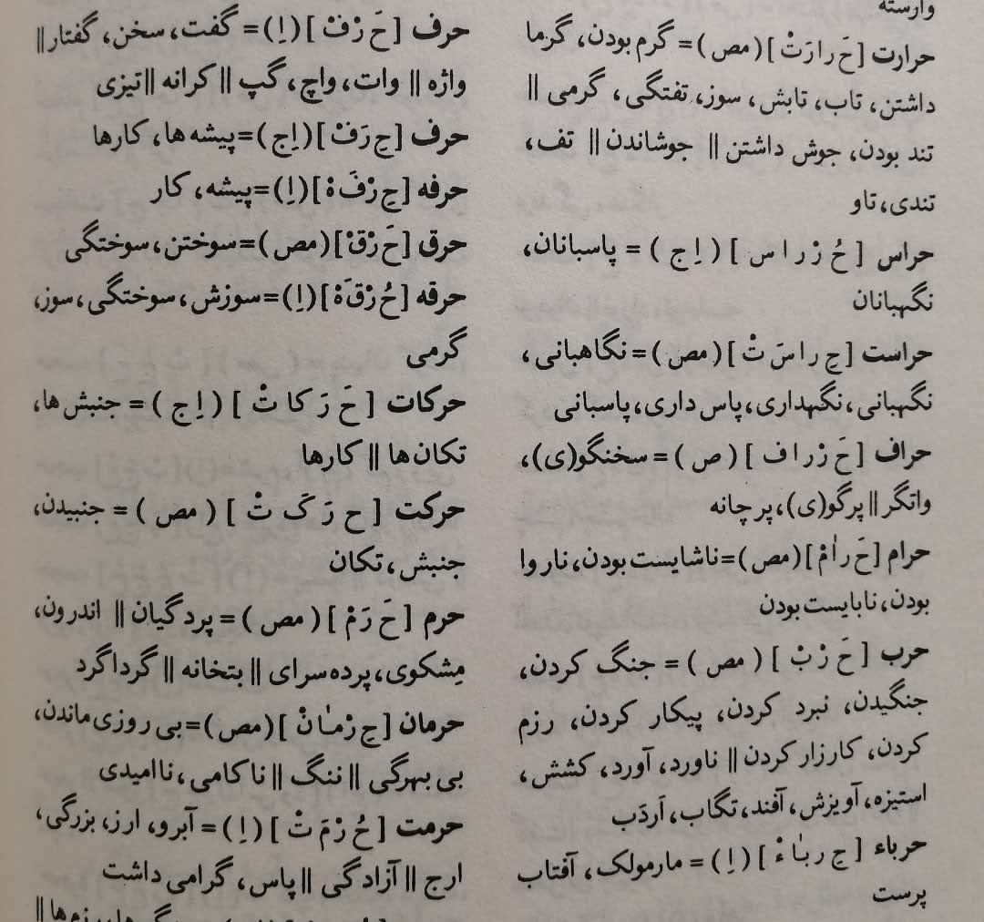از صفحه ۱ تا ۲۵۱ در ۲۹ بخش به هر حرف پرداخته شده. از آنجایی که عربی چهار حرف گ، چ، پ و ژ را ندارد، این ۴ حرف کنار گذاشته شده و یک بخش جدا هم برای آ داریم (یعنی یک بخش «آ» و یک بخش «ا»).